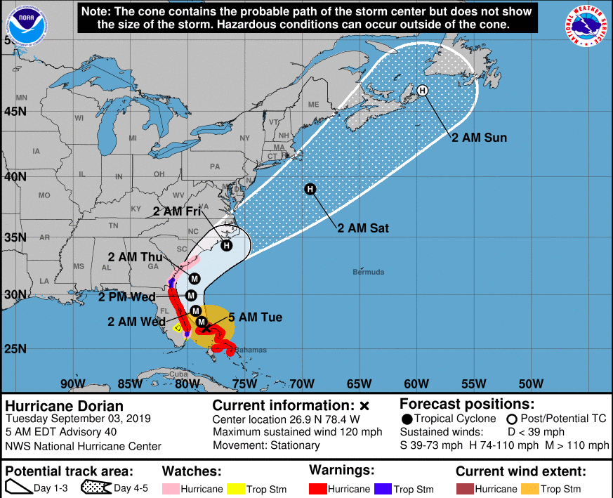Hurricane Dorian remains a category 5 storm and for the time being, has come to a near standstill hovering over the Bahamas. Predictions continue to call fora northerly turn later this week and it is expected to head on a course towards the Cape Fear Region.