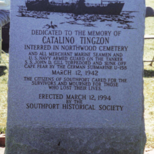 In 1994, the Southport Historical Society erected a monument in Waterfront Park to commemorate Catalino Tingzon and the entire Merchant Marine and US Navy crew of the SS John D Gill.