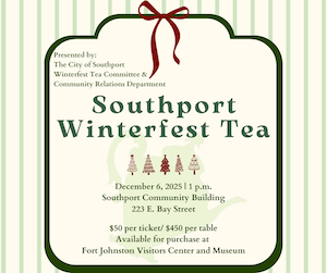 Join us for Southport’s Winterfest Tea, an enchanting tea with special holiday entertainment sponsored by the City of Southport Community Relations Department and the Winterfest Tea Committee. Saturday, December 6, at 1:00 p.m. at the Southport Community Building, located at 223 East Bay Street. Tickets will be $50 and are available at the Ft Johnston Visitors Center and Museum. Proceeds from this year’s event will benefit three local organizations.